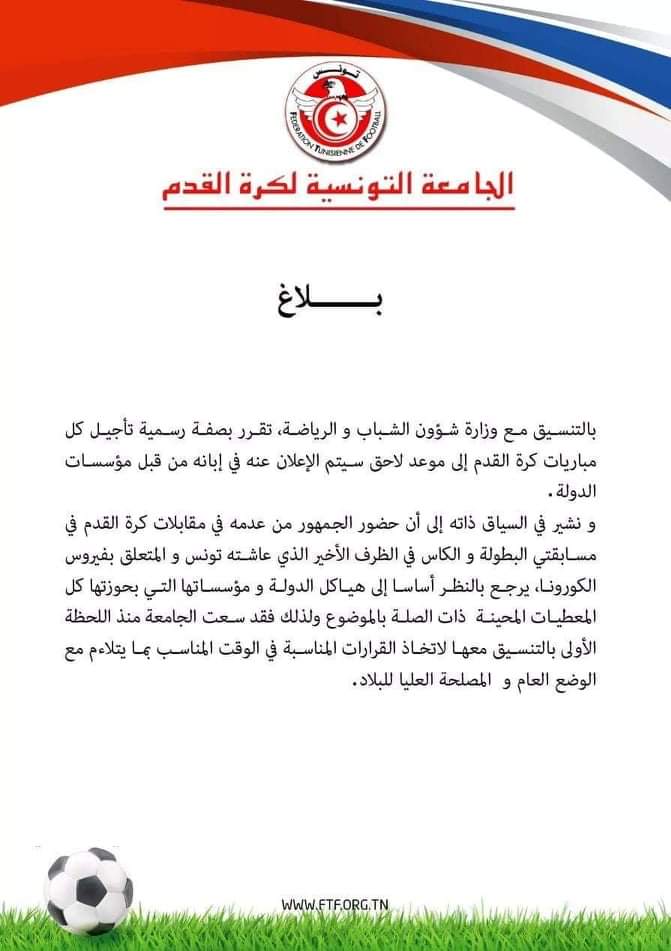 La fédération tunisienne de football vient d’annoncer qu’on commun accord avec le ministère du Sport, les compétitions sont suspendues jusqu’à nouvel ordre.