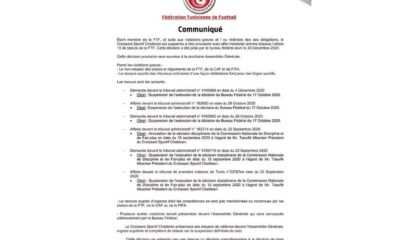 Dans un communiqué publié tard dans la nuit d’hier, la Fédération Tunisienne de Football a annoncé la suspension provisoire du CS Chebba et a annoncé la...