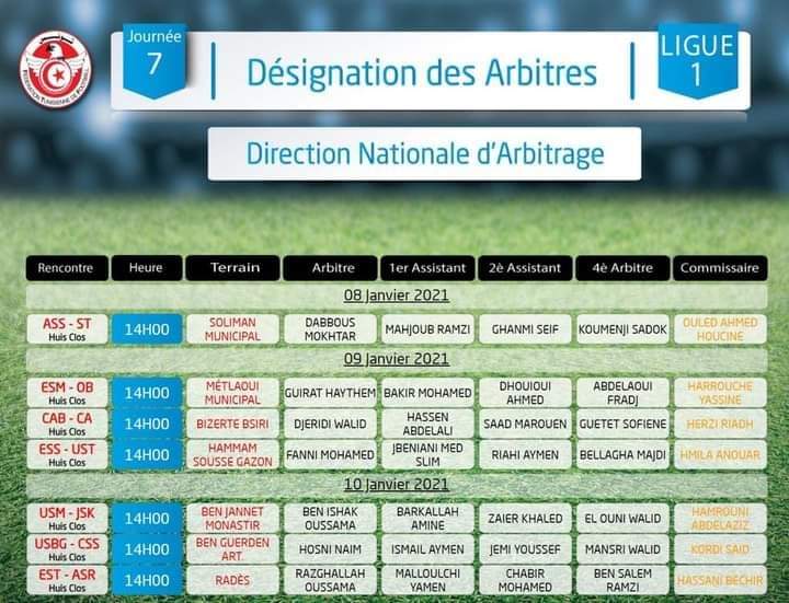 Voici la désignation des arbitres de la septième journée du championnat, prévue le 8, 9 et 10 janvier. (Toutes les rencontres débuteront à 14h00) .