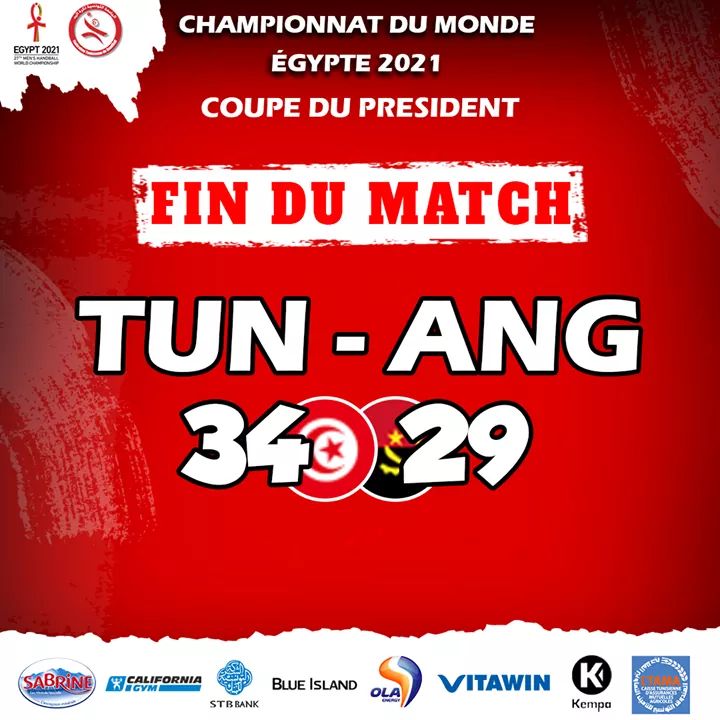 Dans le 3ème match de la coupe du Président (pour les 8 pays éliminés au tour préliminaire) , la Tunisie a battu l’Angola par le score de (34 – 29) (14 – 13) à la mi-temps. Dans cette rencontre , l’ailier droit tunisien Issam Rezig a été élu homme du match grâce aux 11 buts marqués (dont 6 sur jet de 7 mètres). Ses coéquipiers Mohamed Amine Darmoul , la véritable révélation de ce Mondial (6 buts) et Ben Ghali (4 buts) ont également tiré leur épingle du jeu. Grâce à cette victoire , les » Aigles de Carthage » vont jouer le Mercredi 27 Janvier face à l’Autriche pour déterminer la 25ème ou la 26ème place.
