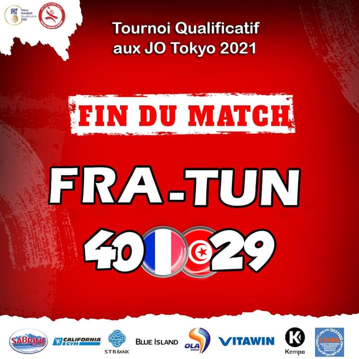Après une première rencontre perdue face au Portugal (27-34 ) , la Tunisie n’ a pas fait le poids face à la France lors de son second match du tournoi additif pour la qualification aux Jeux Olympique d’été à Tokyo en 2021 disputé dans la ville de Montpellier . Elle s’est largement inclinée par le score de (29 40) Elle aura à disputer un 3ème match face à la Croatie.