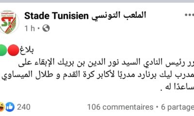 Quelques heures après la désignation de Tarek Jarraya comme nouvel entraîneur du Stade Tunisien, le président du club Nouredine Ben Brick change d’avis et garde le...