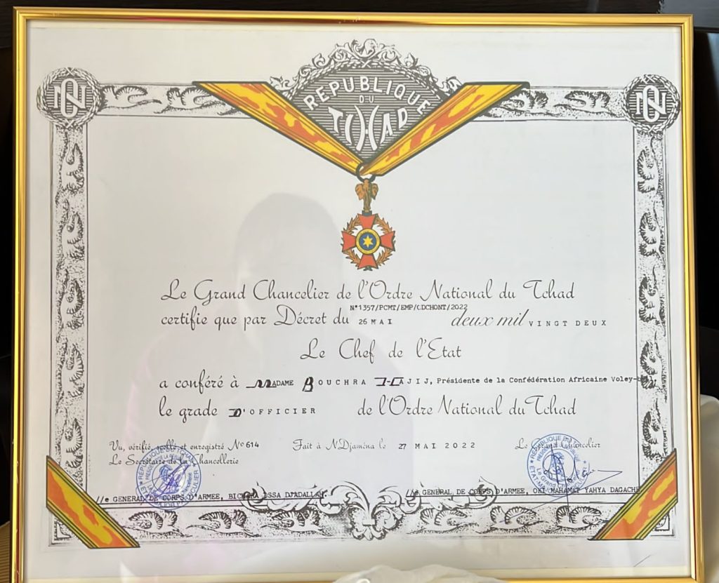Un geste de grande reconnaissance a été accompli en faveur de Madame Bochra Hajjij, présidente de la Confédération Africaine de Volley-ball (CAVB) et vice-présidente de la Fédération Internationale de Volley-ball qui a été reçue mardi par son excellence M. Mahamat Idriss Deby Itno, le Président de la République du Tchad.