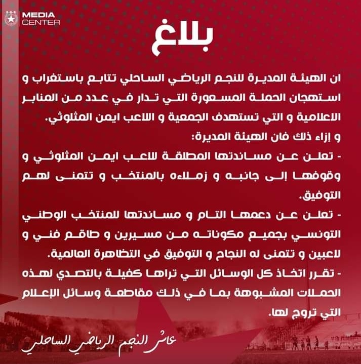 Dans un communiqué publié mardi, le BD de L’Etoile Sportive du Sahel a dénoncé la compagne médiatique à l’encontre de la sélection de son gardien Aymen Balbouli.