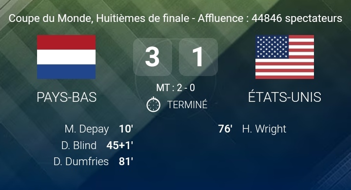 La Hollande dispose avec autorité d’une équipe américaine qui aura d’abord contrôlé le ballon sans parvenir à tromper la vigilance d’un Noppert attentif, puis tenté de revenir sur la fin, mais trop tardivement, trop maladroitement et qui se sera fait punir par un Denzel Dumfries auteur de deux passes décisives et d’un but libérateur. Fin de parcours pour Team USA. Les Pays-Bas affronteront l’Argentine ou l’Australie en quarts de finale, vendredi prochain (20h).