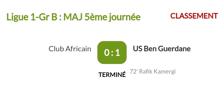 Le Club Africain a été battu par l’US Ben Guerdaine (0-1) vendredi à Radès lors d’une rencontre en retard de la 5ème journée.