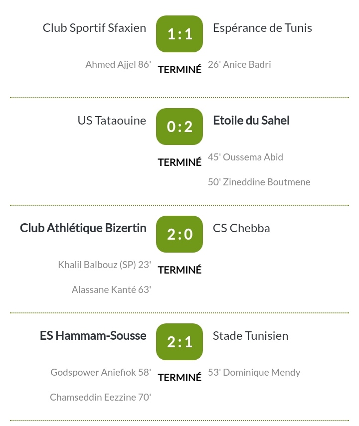 Journée favorable à L’Etoile du Sahel qui a battu l’US Tataouine chez elle 0-2, le CSS a fait match nul avec l’Espérance 1-1.