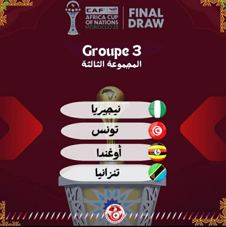 Le tirage au sort pour la CAN Maroc 2025 a eu lieu hier à Rabat et a placé la Tunisie dans la poule C en compagnie du Nigéria ( tête de poule ) ; de l’Ouganda ( niveau 3 ) et de la Tanzanie ( niveau 4). Apparemment et sur le papier , les » Aigles de Carthage » ont toutes les cartes en main pour se qualifier aux 1 / 8ème de finale.Au premier tour , la Tunisie évoluera à Fès et à RabatD’ailleurs voici la composition des 6 poules qui disputeront le premier tour de cette compétition continentale.