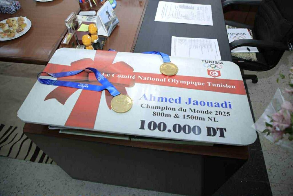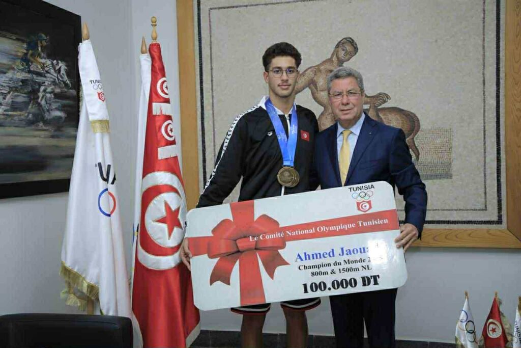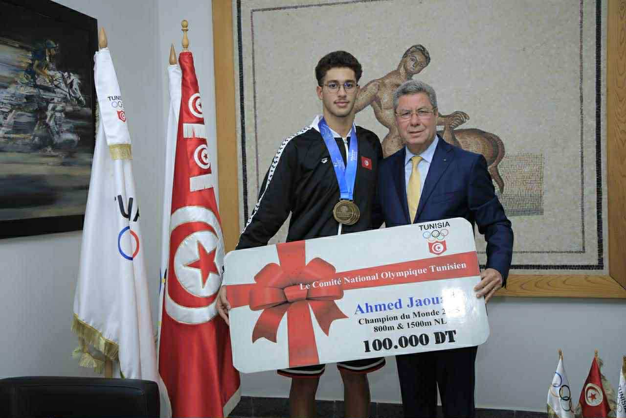 Dans le cadre du soutien continu du Comité National Olympique aux porte-drapeaux de la Tunisie, la rencontre s’est conclue par la remise à Ahmed Jaouadi d’un chèque représentant une prime financière d’un montant de cent mille dinars, attribuée par le Comité aux champions qui hissent haut les couleurs de la Tunisie lors des championnats du monde et des Jeux Olympiques, en récompense de leurs exploits historiques.