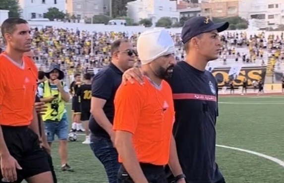 Alors que le Club Africain venait d’ouvrir le score grâce à un but de Firas Chaouat à la 47ᵉ minute, l’arbitre assistant Marouane Saad a été violemment touché à la tête par un projectile, vraisemblablement une pierre lancée depuis les tribunes. Blessé et saignant, il a immédiatement été pris en charge par le personnel médical présent sur place.