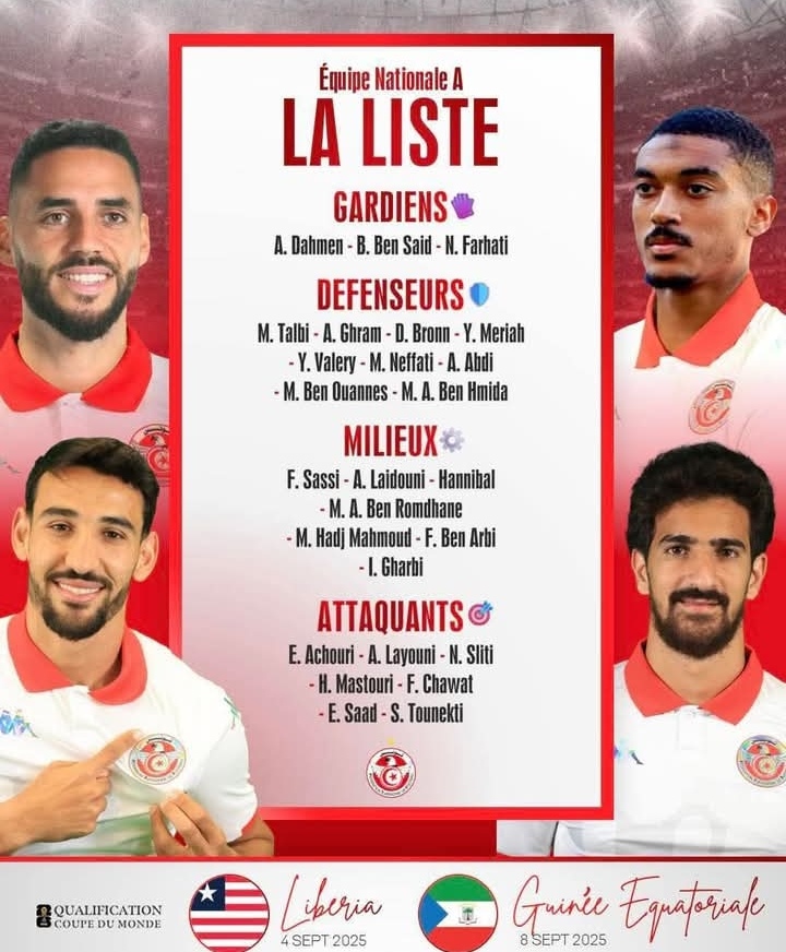 La Tunisie disputera les 4 et 8 septembre deux rencontres face au Liberia (stade Hamadi Agrebi de Rades à 20h00) et face à la Guinée Equatoriale (à Malabo le lundi 8 septembre à partir de 14h00) pour le compte de la 7ème et 8ème journée du groupe H. Voici la liste des joueurs convoqués :